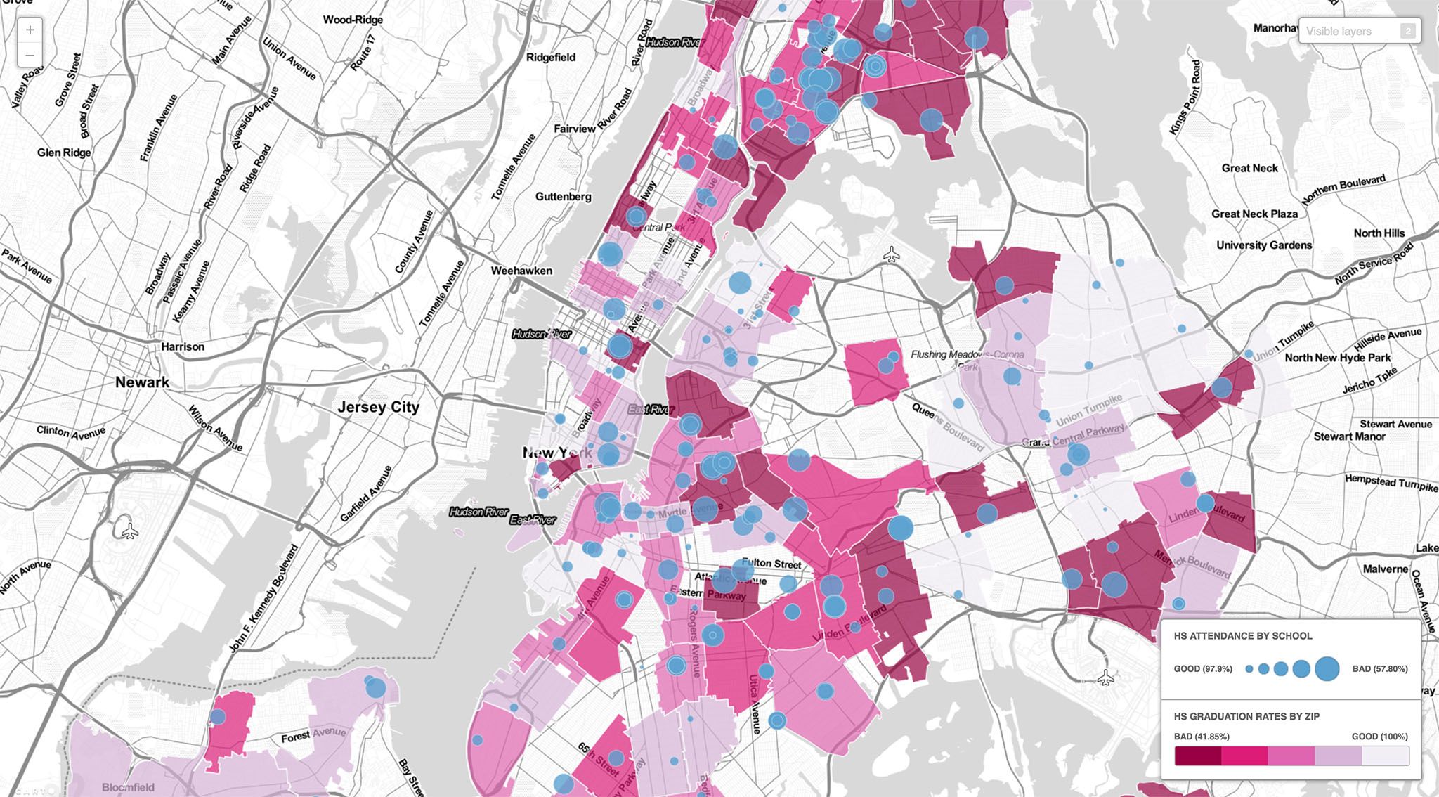 This work has allowed to produce some comprehensive work such as this data vizualisation representing the NYC graduation rates per zipcode.